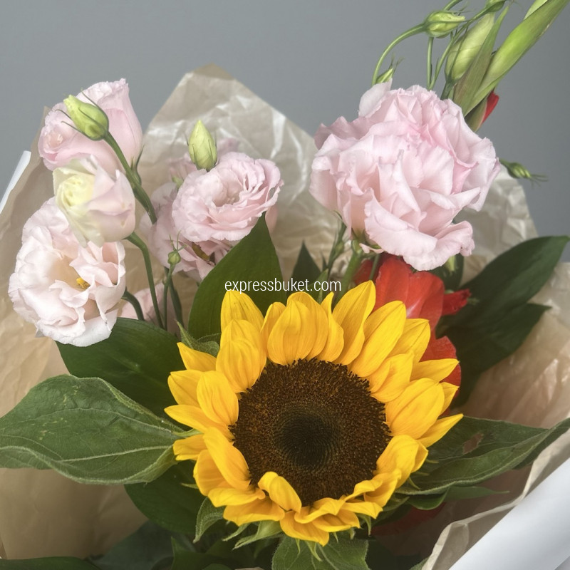 Современная упаковка - 1;Лента атласная - 1;Русскус отеч. - 4;Эустома - 2;Подсолнух - 1;Гладиолус - 1;